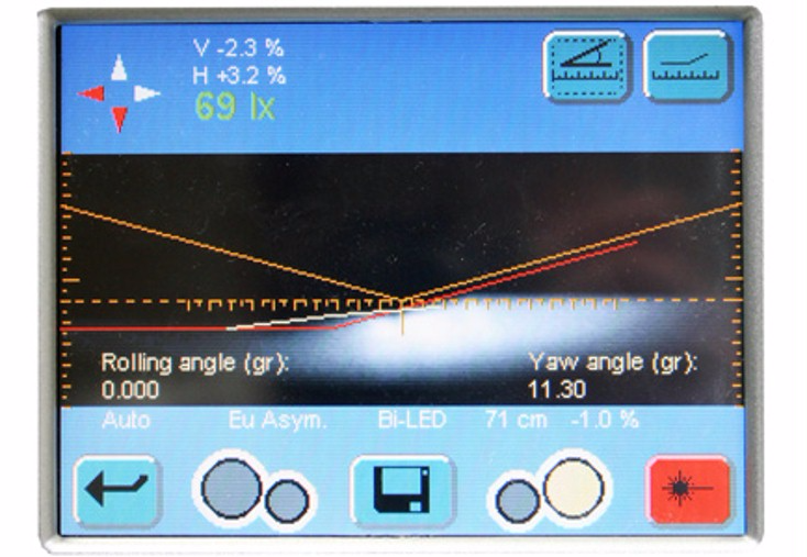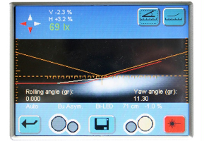 - Die Messergebnisse erscheinen gleich mit Bewertung: Horizontale Abweichung, Vertikale Abweichung (Nickwinkel), Intensität, Roll-Winkel und Gier-Winkel