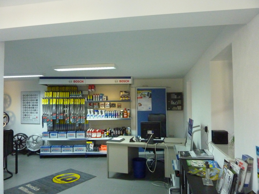 - Bosch Ausstellungsregal für Scheibenwischblätter und Starterbatterien.