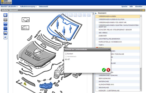Erfassung aller Schadenpositionen in der Explosionsdarstellung des Fahrzeuges am Bildschirm durch einfaches Anklicken der konkret beschädigten Teile